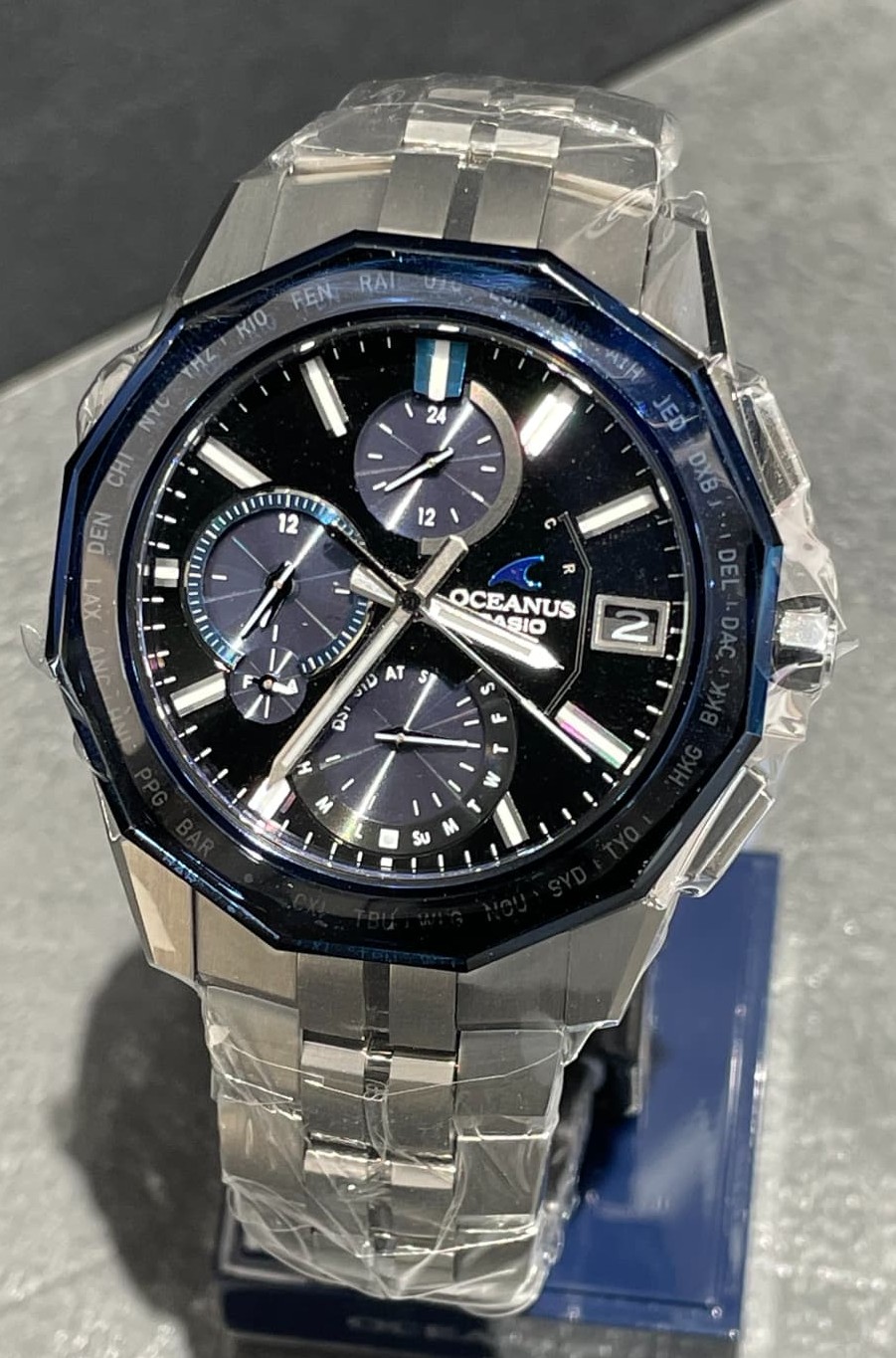 ベゼルは、厚みのあるサファイアガラスベゼルに24面のファセットカットを採用。あらゆる角度から透明感ある美しいブルーが楽しめるよう、ブルーブラックグラデーション蒸着を基調に、蒸着、スパッタリング処理を複数回、複雑にかけて着色しています。また、視認性を高めるため漆黒の鏡面文字板を採用。時分針は断面が台形形状の3面カット針で、天面にヘアライン、両サイド斜面にミラー仕上げを施し、ケースとバンドにもシルバーの輝きが特徴的なチタンカーバイトを施しています。機能面では電波受信機能による時計単体での時刻修正に加え、Bluetooth®を利用したスマートフォンリンクによる時刻修正機能を搭載。ワールドタイムの時刻を約300都市から設定したり、自動でタイムゾーンやサマータイムの変更に対応できます。機能性とデザイン性を兼ね備えた上質なOCEANUS マンタです。