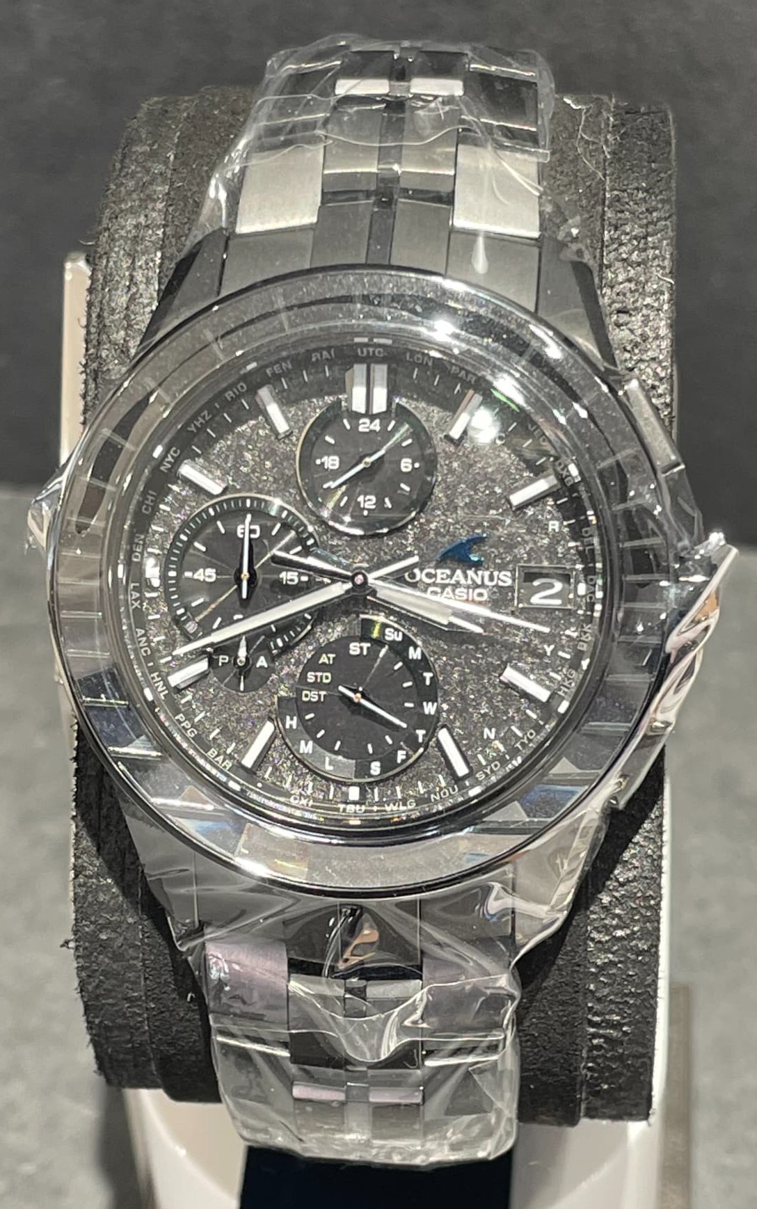 OCW-S7000CN-1Aは、OCEANUSが誇るものづくりの技術と日本の伝統技法が美しく融合したモデルです。上下で異なるカッティングラインが美しいサファイアガラスベゼルが特徴で、江戸切子の職人が一つひとつ手作業でカットを施して仕上げています。