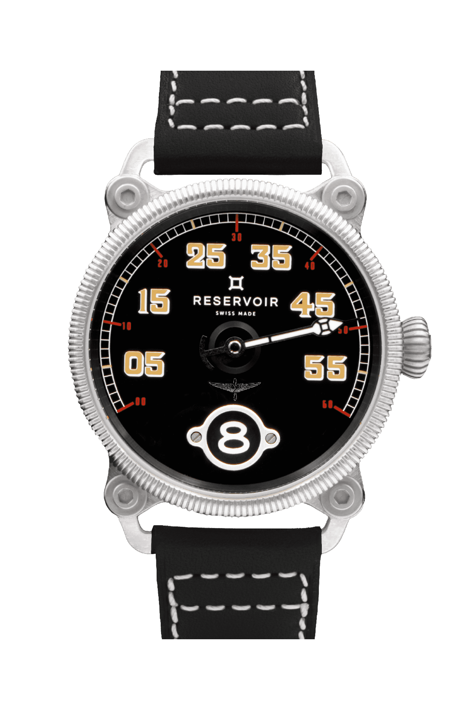アール・ヌーヴォー調のルミノバインデックスを配したブラックダイヤル、ビス止めされた新設計のブラックケース、ブラックレザーストラップを装備。過去の計器をそのまま腕に装着したかのようなタイムピースは、大胆に空を目指す者のための時計です。