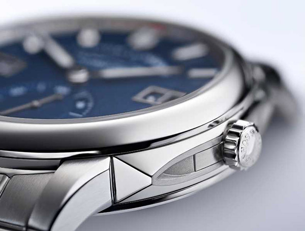 3層構造の直径40.5mm、厚さ11.1mmのケースは、サイドから見ると少し盛り上がっているデザイン。どちらかと言えば丸みのある柔らかな曲線構造の印象が強い従来のランゲと全く異なるのは、立体的・直線的かつ細かな傾斜を加えたケース構造にある。これを端的に表現したのが3時側から見るケースサイドと、ラグ並びにブレスレットの形状だ。これらには細かな角度が随所に付けられており、各々にポリッシュとサテン仕上げによる多面体構造を呈している。その作業は実にきめ細かい。