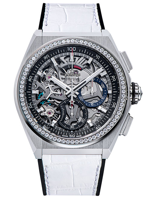 ベゼルにラウンドブリリアントカットが施されたダイヤモンドをセットし、ホワイトレザー・ストラップとのコンビネーションがエレガントかつ爽やかな雰囲気を放つブティック限定モデル。オープンワークのダイアルから覗く1/100秒計測のクロノグラフムーブメント、エル・プリメロ9004の精緻な動きにも魅了される。