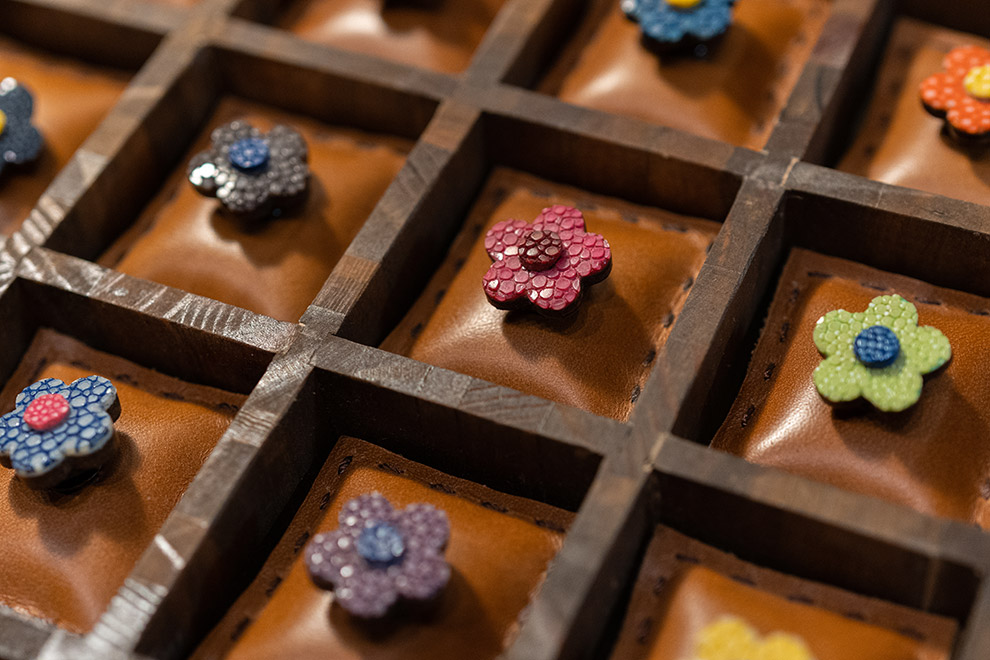 注文のシステムは、まずセミオーダー。革を選び、長さやステッチの色、裏の素材などを選んでいただきます。それ以外ではブレスレットやブートニエールなど革小物。それでも時間が足りず、気がつくと終電の時間だったりします。
