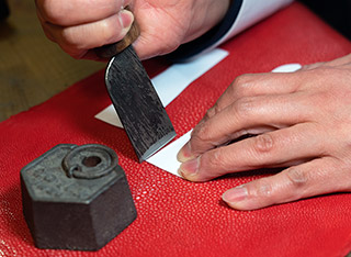 ガルーシャの革に型紙を当てて革包丁で切り出す。“石”と呼ばれる硬い組織を持つガルーシャ革は刃物にも負担がかかるという。この革包丁のハンドルも持ちやすいように小島さんはカスタマイズ。