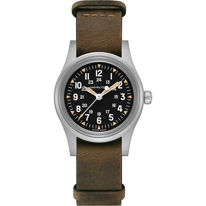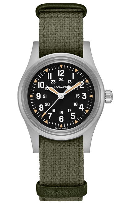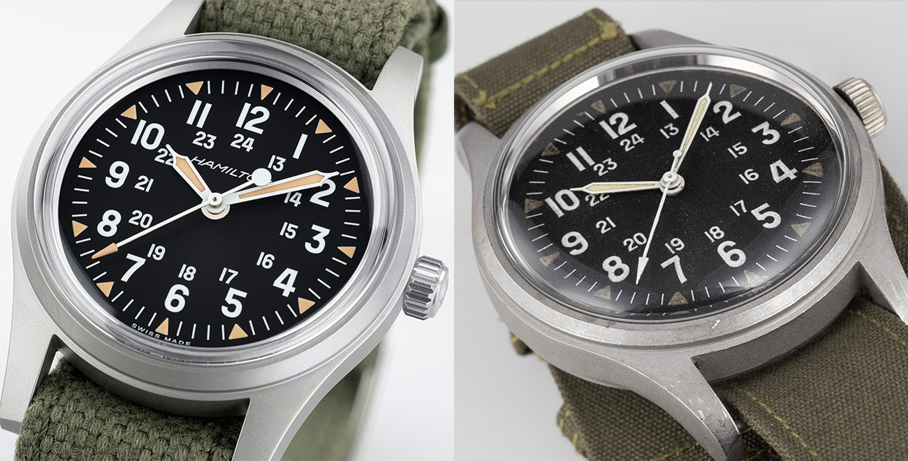今回ハミルトンが発表した「カーキ フィールド メカ 36mm ジャパン エディション」は、まさにこの1970年9月のみに発行されたミルスペック「ハミルトン FAPD 5101」の忠実な復刻モデルだ。先端の尖ったペンシル型時分針や矢尻型の秒針、アクリル製ボックス型風防、さらに戦闘中のストラップの破損を防ぐ固定式バーまでも再現している。外見上の唯一の違いと言えば、1970年代に使用された斜体のかかった「HAMILTON」ロゴの追加だ(しかし、軍用時計では製造時計会社名は無記載が基本だから、これは当然の判断)。ちなみにハミルトン史において「カーキ」が登場するのは1980年代である。