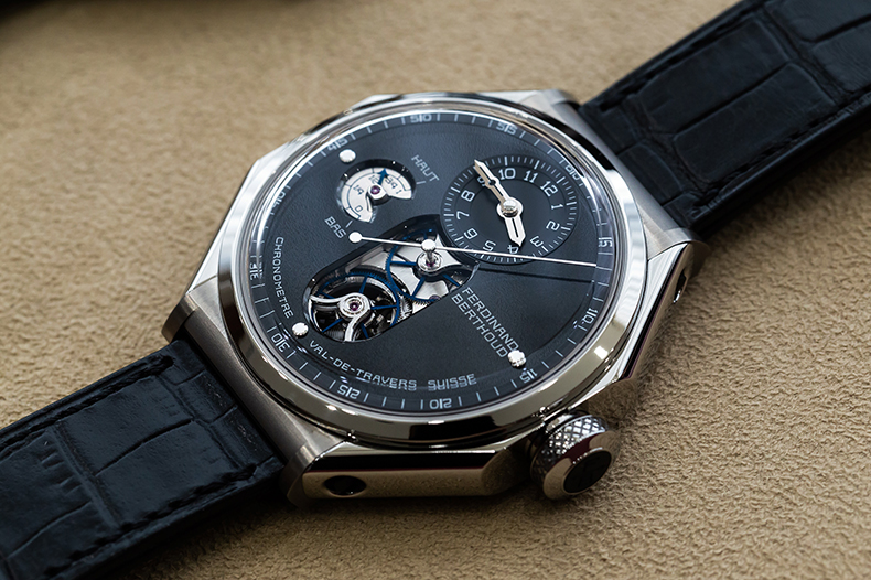 2015年のパリのエキシビションで発表された復活第一作「クロノメーター フェルディナント・ベルトゥー FB 1」。フェルディナント・ベルトゥーが製作したマリンクロノメーターをモチーフとする防水窓の付いた8角形のケースには、自社開発・製造による「キャリバーFB-T.FC.」が搭載されている。
