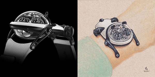 デュシェンヌ型筋ジストロフィー症を知るMB&F創設者のマキシミリアン・ブッサ氏が、ブランドとして第6回目の出品となる2021年のオークションに選んだモチーフが“パンダ”。「HM10 Panda for Only Watch(オロロジカルマシーン10 パンダ フォー オンリーウォッチ)」は、病で苦しむ子供達が笑顔になることを祈って製作。これは2020年の新作「HM10 Bulldog(オロロジカルマシーン10 ブルドッグ)」の改訂版とも言え、ケースがパンダの胴体で6時位置のドーム部が頭(その上部には両耳が立っている)、4つのラグは足を模しており、腕にはめると小さなパンダが着用者側へ頭を向けて手首に座る姿勢となる/手巻き、自社設計・製造ムーブメント、18,000振動/時、パワーリザーブ45時間。ステンレススティール(上部)&チタニウム(下部)ケース、ケースサイズ縦54×横45×厚さ24mm。
