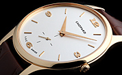 まずは2006年にデビューし、ジュネーブ・ウォッチメイキング・グランプリにおいて、超薄型時計部門でグランプリを受賞したドレス系の二針ウォッチ「L.U.C XP」に、新たにスモールセコンドを加えた最新版、「L.U.C XPS」に注目したい。意匠の美しさはもちろん、今回初めてシースルー化された裏蓋から、マイクロローター(回転錘)が回転してゼンマイを巻き上げるさまが展望できるのも、マニア心をくすぐるポイントだ。