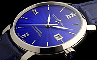 2009年のバーゼルワールド発表の最新作にも、やはりクロノメーター取得モデルが続々とエントリー。そのひとつが、ユリス・ナルダンの新しい定番になるであろう、旧モデルからサイズアップした3針モデル「クラシコ」である。豊富なバリエーションをもつ同シリーズの中でも、ブルーエナメルとギョシェ彫りが組み合わさったダイヤルは、とりわけ美しく艶かしい。