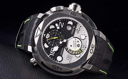 "テクノリュクス"がキーワードとなる「ハイドロスカフ」だが、ステンレススチール・ケースを使用するモデルには、素材に応じたカジュアル感も追加している。例えばここで紹介する新デザインのダイアルだ。