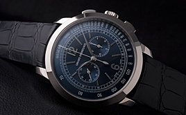 2010年に登場したクロノグラフ・モデルは、センターにスモールセコンドと30分積算計を並列するクラシックな顔つきで人気を博した。そして2011年は発展版として、ホワイトゴールド・ケースのモデルが登場。しかもダイアルカラーは深みのあるブルー。シックで落ち着きのある雰囲気に仕上がっている。