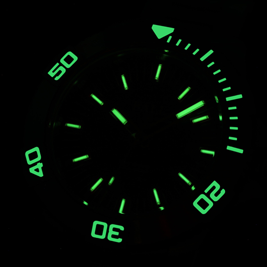 仕様:時・分・秒表示、日付表示、針・文字盤に15個の自発光マイクロ・ガスライト、ベゼル目盛りにスーパールミノバ、ブラックダイアル、リューズビルトイン型自動減圧バルブ、ねじ込み式リューズ、逆回転防止機能付ステンレススティールベゼル、反射防止処理済みのサファイアガラス(4mm厚)、耐磁性 4,800A/m、耐衝撃性 7,500Gs(高さ1.5mから自由落下にて木の床に落とした時に受ける衝撃と同等の衝撃テストを実施)