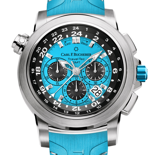 仕様:時・分表示、スモールセコンド、日付表示、クロノグラフ、スリータイムゾーン表示、ブルーダイアル