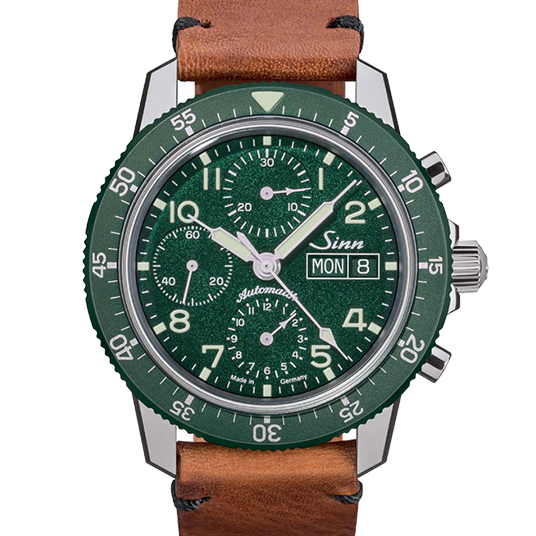 仕様:時・分表示、スモールセコンド、クロノグラフ(30分積算計、12時間計)、デイデイト表示、アルマイト仕上げを施したグリーンの両方向回転式パイロットベゼル、秒針ストップ機能、耐磁性DIN8309、時・分・クロノグラフ秒針・インデックスとベゼルのキーマークは夜光処理、メタリックグリーンダイヤル、ドーム型両面無反射サファイアクリスタル、ねじ込み式シースルーバック(内側に無反射コーティングを施したサファイアクリスタル)、ねじ込み式リューズ