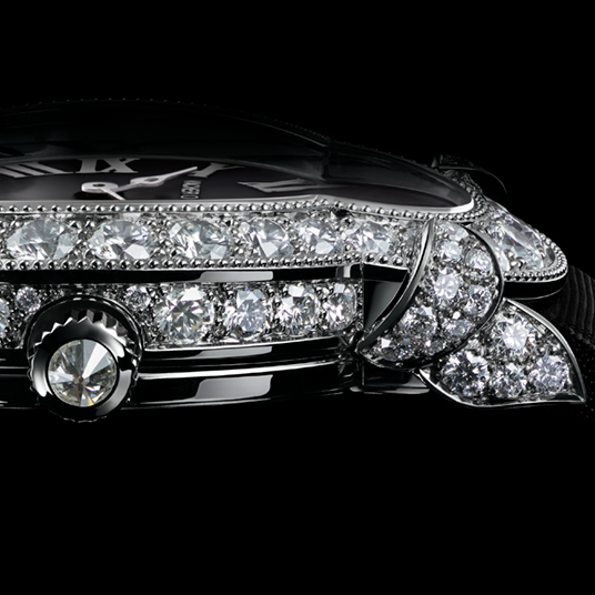 ストラップ:ブラックサテン、ダイヤモンドをセットした18Kホワイトゴールドのフォールディングクラスプ(ラウンドカット・ダイヤモンド18個)、2本目としてブラックのミシシッピ・アリゲーターレザーストラップ付属、ダイヤモンド総計計123個、約2.60カラットのラウンドカット・ダイヤモンド