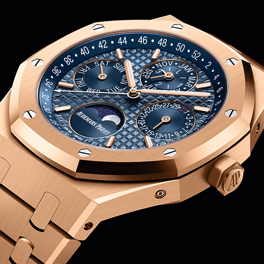 仕様:時・分表示、パーペチュアルカレンダー(週表示、曜日、デイト、アストロノミカル ムーン、月、閏年)、「グランドタペストリー」模様のブルーダイヤル、サブダイヤルとインナーベゼルは「ナイトブルー、クラウド 50」、蓄光処理を施したピンクゴールドのアプライドアワーマーカーとロイヤル オーク針、反射防止加工サファイアガラスとケースバック
