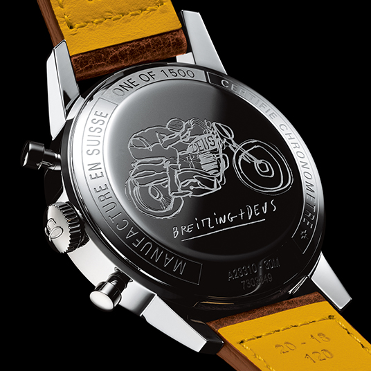 仕様:時・分・秒表示、クロノグラフ、稲妻の形をしたクロノグラフ針、ケースバックにデウスのクリエイティブディレクター、カービー・タックウェルがデザインした疾走するレトロなモーターサイクリストの刻印