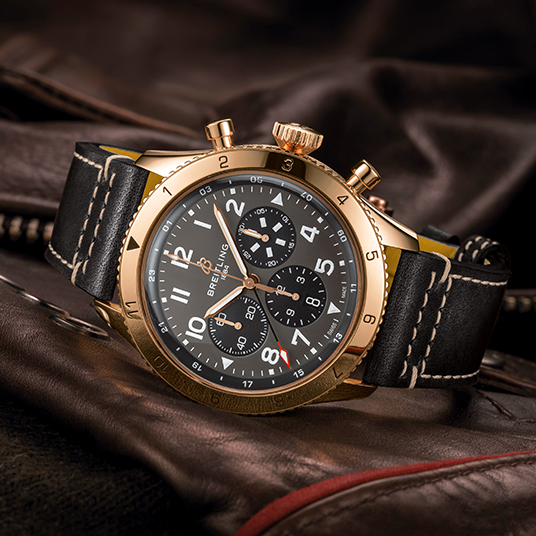 ストラップ:パイロットに着想を得たブラックのレザーストラップ、18Kレッドゴールド製フォールディングクラスプ