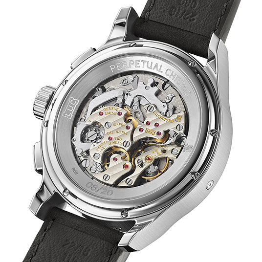 仕様:時・分表示、6時位置にスモールセコンド、12時位置にビッグデイト表示、9時位置に曜日表示、3時位置に月表示、6時位置の回転式開口部に現れるムーンフェイズ、10時位置にオフセンターのデイ/ナイト表示、2時位置にオフセンターの閏年表示、フライバック機能付き垂直カップリングクラッチ式クロノグラフ(9時位置に12時間積算計、3時位置に30分積算計、半瞬間機能の分表示)、手作業でギョーシェ模様を施したブラックロジウム仕上げのソリッドゴールド製文字盤、シースルーケースバック