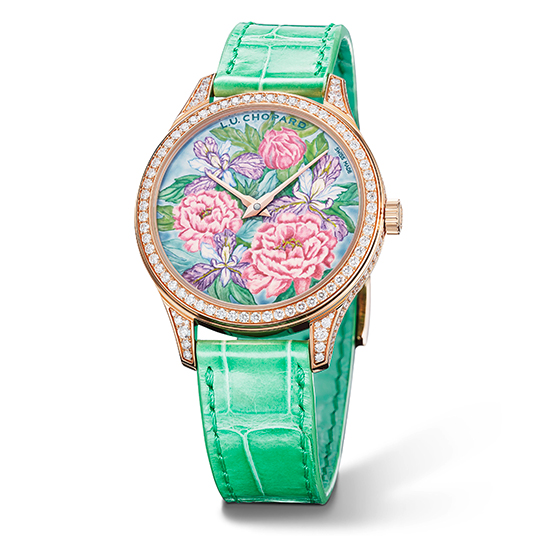 仕様:時・分表示、ショパール マニュファクチュールのエナメル職人がグラン・フー・エナメルの技法を用いて制作した牡丹モチーフの文字盤、ゴールド仕上げを施したドーフィンフュゼ型の時・分針、シースルーケースバック