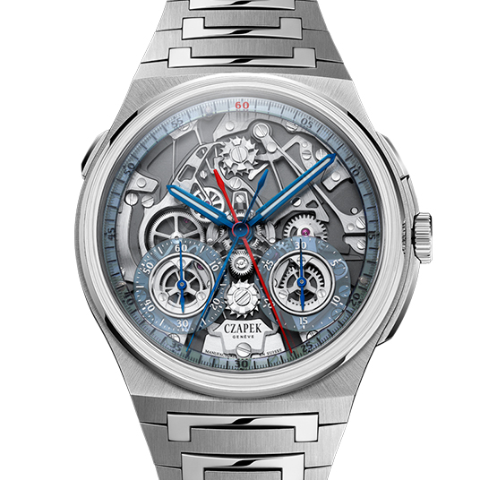 仕様:時・分表示、30分積算カウンター、スモールセコンド(7時30分位置)、スプリット・セコンドモノプッシャー・クロノグラフ、ダイアル側に配置されたオープンワークのスプリット・セコンド機構(世界初)、PVD処理によるブルー・フュメ仕上げのサファイア・ダイアル、ミニットリングとサブダイアルリング