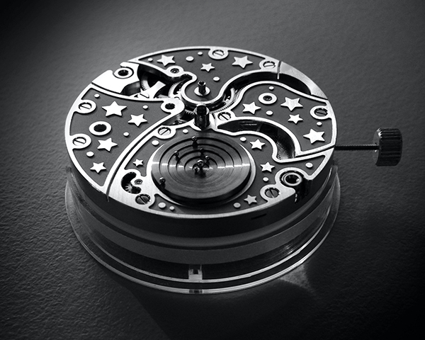 自動巻きのCal.CVDK7386は「プラネタリウム アイゼ・アイジンガー リミテッド・エディション」にも採用される、世界最小の機械式プラネタリウム・ムーブメント。ツインバレルで最大約96時間のパワーリザーブ機能を持つ。ムーブメント径35.0×厚さ6.8mm、毎時28,800振動。シースルーケースバックから見えるローターには、CVDKのシグネチャーである12個の“爪”を持つ太陽を中心に、地球や土星等の惑星と星等が刻印される。