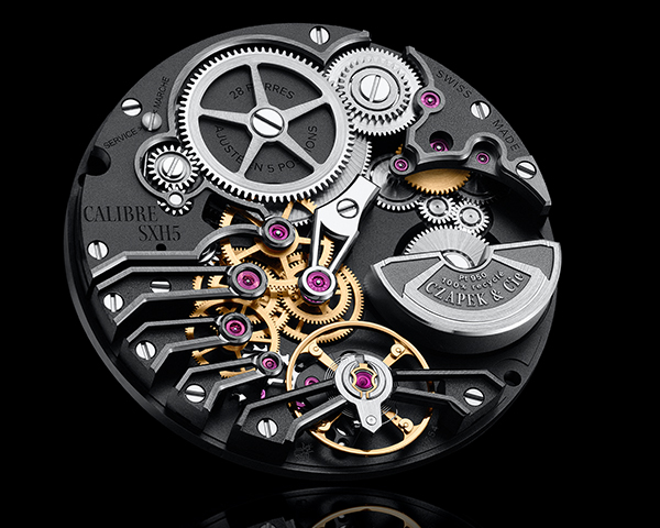 2020年発表のチャペック初の自社ムーブメント、Cal.SXH5。自動巻き。プラチナ製マイクロローターや、4つのゴールド製慣性マスロット(ウェイト)を備えるフリースプラング・テンプ装備。マイクロローターはスイス以外の唯一のパートナー企業であるドイツのAGOSI社製。コンポーネントとムーブメントの製造はメインパートナー企業のクロノード社を含めて計15社、ケースやダイアル等の外装部はメインパートナー企業のメタレム社を含めて計6社が担当。ムーブメントの案出はチャペックのコンセプト担当、ダニエル・マルティネス氏。直径30.0×厚さ4.2mm、部品数193個、28石、毎時28,800振動数(4Hz)、パワーリザーブ60時間。