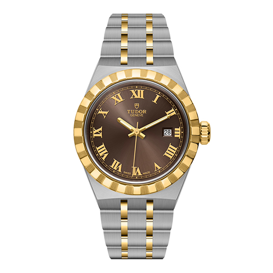 仕様:時・分・秒・日付表示、秒停止機能による正確な時刻設定、イエローゴールド製ノッチドベゼル、チョコレートブラウンダイアル