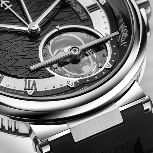 仕様:センターに時・分(平均太陽時)、センターに分(真太陽時)、トゥールビヨンにスモールセコンド、9時から3時位置にレトログラード日付表示、10時30分位置の曜日表示、1時30分位置の閏年・月表示、パワーリザーブ表示、ホワイトゴールド文字盤、ブラックのセンターディスク、手作業によるギヨシェ彫りの「ウェーブ」模様、サーキュラーサテン仕上げのアワーサークル、アプライドの18Kゴールド製ブラックローマ数字、18Kゴールド製のピラミッド型蓄光インデックス、サファイアケースバック