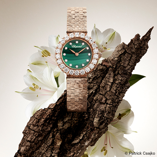仕様:時・分表示、ブリリアントカットダイヤモンドをセットしたベゼル、インデックスにブリリアントカットダイヤモンドをあしらったマラカイト文字盤、ゴールド仕上げを施したリーフ型の時分針