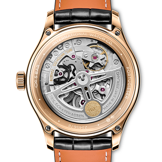 搭載される自社製ムーブメントの自動巻きCal.82200は、IWCの自社ムーブメント・ラインナップの82000シリーズに属する。当シリーズは、自動巻きローターの双方向巻き上げ回転運動を利用するペラトン式自動巻き機構を搭載することで、巻き上げ効率の向上を実現。これにより60時間のパワーリザーブを獲得した。また巻き上げ爪やカム等の主要パーツは耐摩耗性に優れるセラミック製を採用。IWCはおそらく10年以上の月日をかけて自社の全ファミリー・コレクションに自社製ムーブメントを搭載する計画を実行してきたが、ポルトギーゼは2020年に当計画が完了した。今回はフロントとケースバックの両面にダブルボックスガラスを採用。これは今回の新作「ポルトギーゼ・エターナル・カレンダー」や「ポルトギーゼ・パーペチュアル・カレンダー 44」にも採用されている。