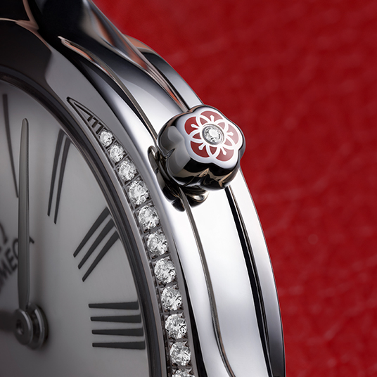 仕様:時・分表示、リュウズにダイヤモンド、ミラー仕上げのケースバックにフラワーパターン、オフホワイトのグラン・フーエナメル ダイアル