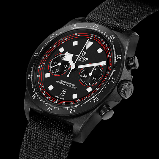 仕様:時・分表示、クロノグラフ、センター配置の時針・分針、中央にクロノグラフ秒針、45分積算カウンター(3時位置)、スモールセコンド針(9時位置)、瞬時に変わる日付表示(6時位置)、禁止時間帯なし、秒針停止機能による正確な時刻設定、チタニウム製リューズにチューダーのシールドロゴの刻印、マットブラックダイアル、クロノグラフカウンターとタキメーター目盛りにレッドのアクセント