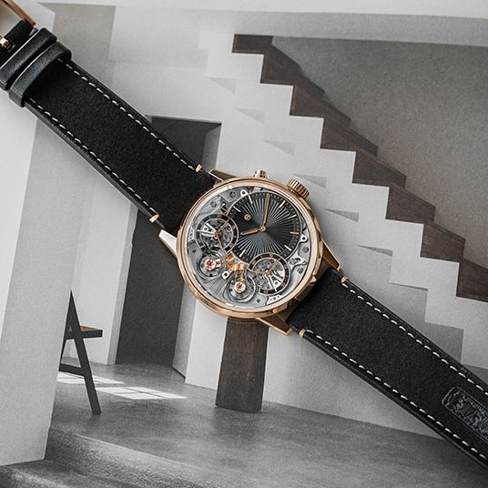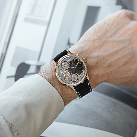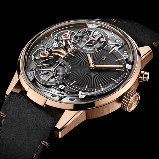 仕様:時・分・秒(ツインセコンド)表示、レゾナンス・クラッチ・スプリングで結ばれた2つの独立した調整機構、ギョーシェ・パターンが施されオフセンターに配置されたブラックダイヤル、反射防止加工サファイアクリスタルのフロント及びケースバック