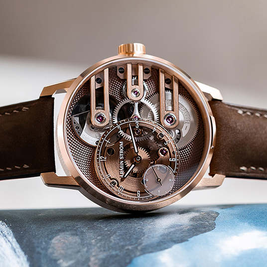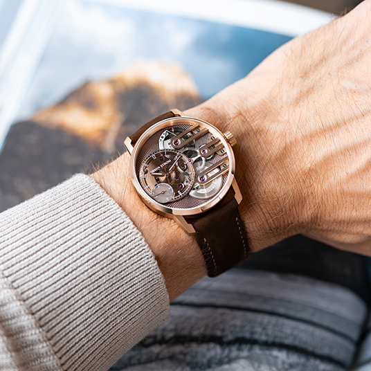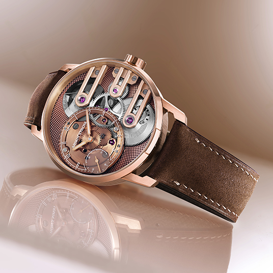 仕様:時・分・秒表示、パワーリザーブ・インジケーター、オフセンターに配されたブラウントーンのサファイアダイヤル、カリ・ヴティライネンによるギョーシェ模様のブラウンPVDプレート、反射防止加工サファイアクリスタルのフロント及びケースバック
