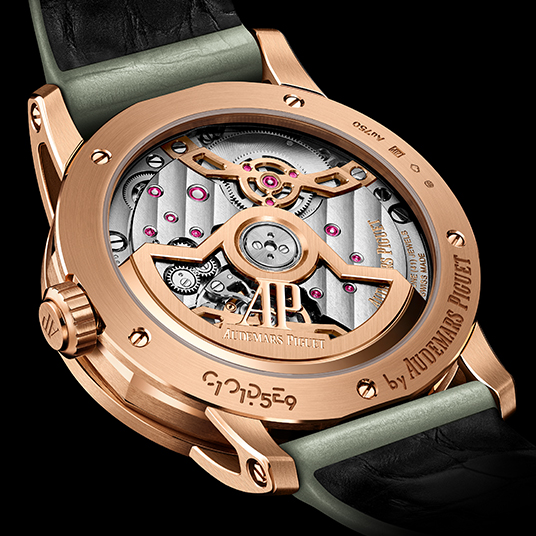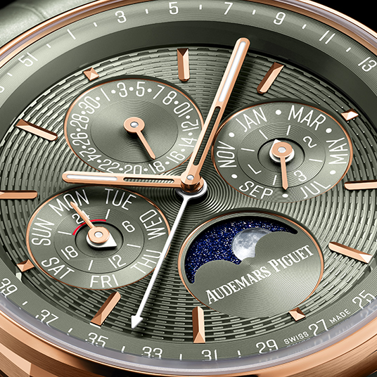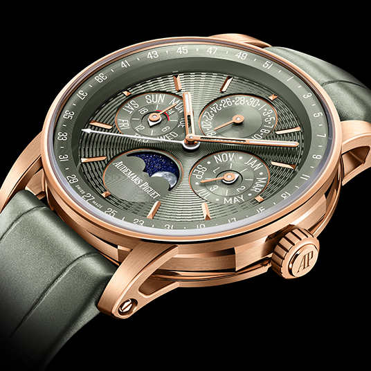 仕様:時・分表示、週番号表示付きパーペチュアルカレンダー(曜日、日付、ムーンフェイズ、月、閏年)、グリーンのエンボス加工によるシグネチャーダイヤル、グリーンのサブダイヤル、18Kピンクゴールドのアワーマーカー、蓄光加工が施された18Kピンクゴールドの針、スネイル仕上げが施されたグリーンのインナーベゼル、ダブルカーブの反射防止加工サファイアクリスタル、反射防止加工サファイアケースバック