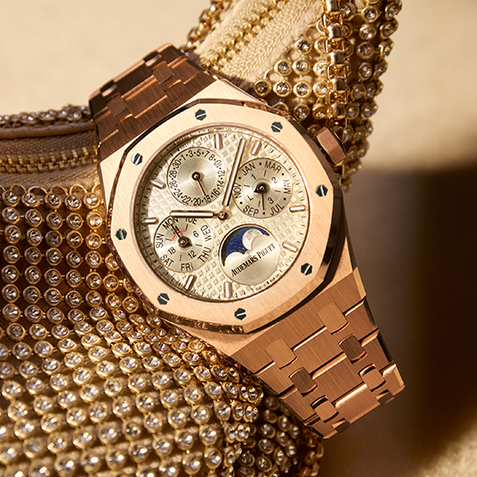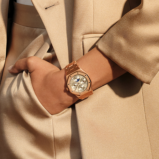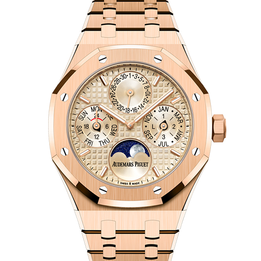 仕様:時・分表示、パーペチュアルカレンダー(曜日、日付、ムーンフェイズ、月、閏年)、グランドタペストリー模様のベージュダイヤル、ベージュのサブダイヤル、蓄光加工が施された18Kピンクゴールドのアワーマーカーとロイヤル オーク針、18Kピンクゴールドのインナーベゼル、反射防止加工サファイアクリスタルとケースバック