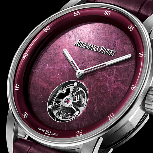 仕様:時・分表示、フライング トゥールビヨン、天然ルビールートダイヤル、蓄光加工が施された18Kホワイトゴールドの針、レッドインナーベゼル、ダブルカーブの反射防止加工サファイアクリスタル、18Kホワイトゴールドと反射防止加工サファイアケースバック