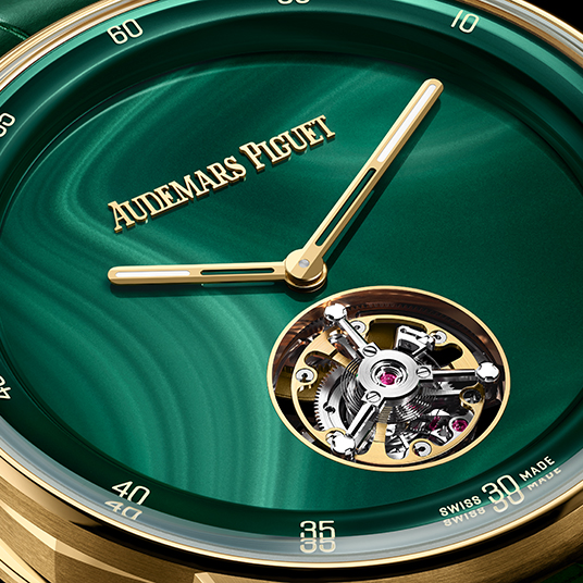 仕様:時・分表示、フライング トゥールビヨン、天然グリーンマラカイトダイヤル、蓄光加工が施された18Kイエローゴールドの針、グリーンインナーベゼル、ダブルカーブの反射防止加工サファイアクリスタル、18Kイエローゴールドと反射防止加工サファイアケースバック