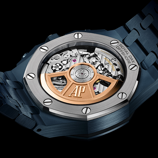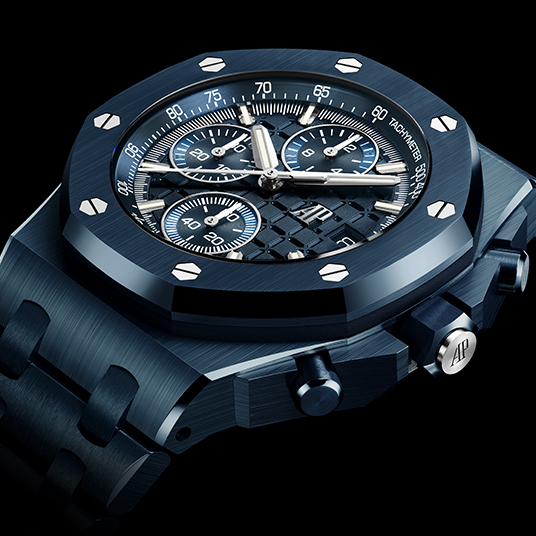 仕様:時・分・秒(スモールセコンド)・日付表示、フライバック クロノグラフ、反射防止加工のサファイアクリスタルとケースバック、チタン製ケースバックフレーム、“ナイトブルー、クラウド50”セラミック製プッシュボタンとプッシュボタンガードとねじ込み式リューズ、チタン製リューズトップ、“ナイトブルー、クラウド50”メガタペストリーダイヤル、“ナイトブルー、クラウド50”カウンター、蓄光加工を施した18Kホワイトゴールド製ロイヤル オーク オフショア針とアワーマーカー、“ナイトブルー、クラウド50”インナーベゼル