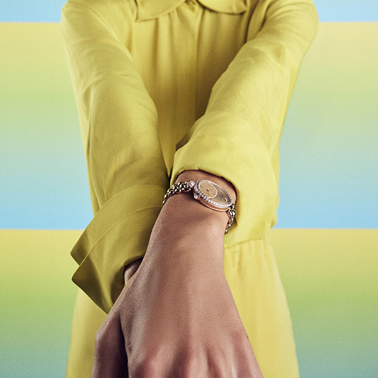 仕様:時・分表示、手作業による「ケ・ド・ロルロージュ」模様のギヨシェ彫りの18Kブレゲゴールド製文字盤、12時位置にペアシェイプのダイヤモンド、チャプターリングにダイヤモンド46個、ベゼルとフランジに107個のブリリアントカット・ダイヤモンド、6時位置の丸いセンターラグに52個のブリリアントカット・ダイヤモンドをスノーセッティング、リュウズにブリオレットカット・ダイヤモンド、サファイアクリスタルケースバック