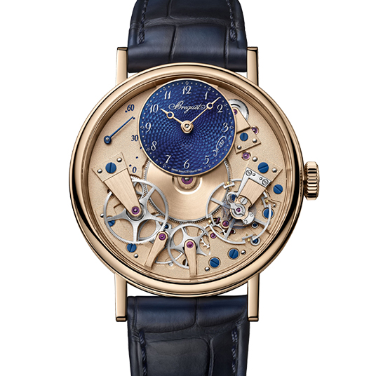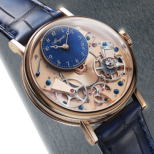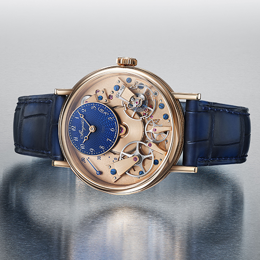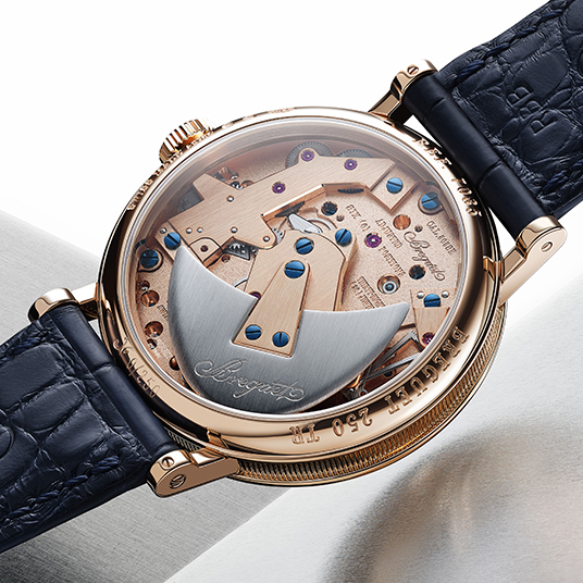 仕様:オフセンターの時・分表示、レトログラードセコンドによる秒表示、12時位置オフセンターの18Kブレゲゴールド製文字盤にブルーの半透明グラン・フー エナメルと手彫りギヨシェによる「ケ・ド・ロルロージュ」模様、シースルーケースバック、ブレゲが使用していたモロッコ革のケースから着想した赤いレザーの250周年スペシャルエディションボックスが付属