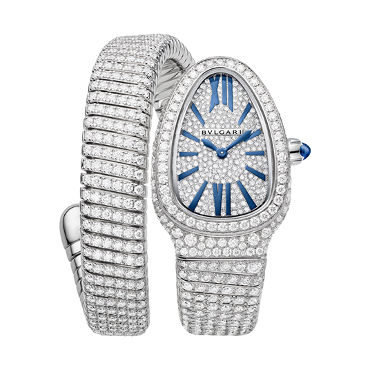 仕様:時・分表示、ダイヤモンドをあしらったホワイトゴールド製ベゼル、カボションカットサファイアをあしらったホワイトゴールド製リューズ、ブリリアンカットダイヤモンドパヴェダイアル、ブルーの針およびインデックス