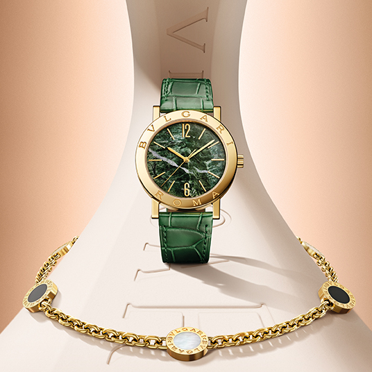 仕様:時・分・秒表示、BVLGARI ROMAのロゴが刻印されたイエローゴールド製ベゼル、イエローゴールド製リューズ、ヴェルデ・アルピ大理石ダイアル、ゴールドインデックス、50th anniversaryの文字が刻印されたケースバック
