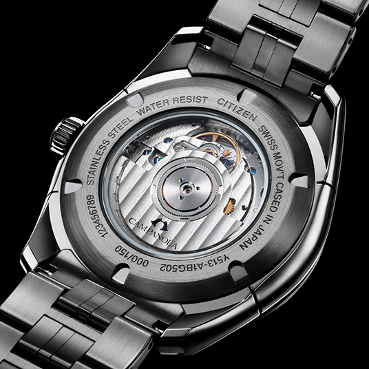 仕様:時・分・秒表示、ビッグデイトカレンダー、パワーリザーブ表示機能、秒針停止機能、日付早修正機能、漆塗り文字板(電気鋳造+漆塗り+螺鈿)、シースルーバック(サファイアガラス)