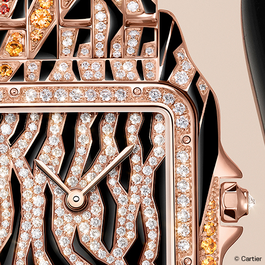 仕様:時・分表示、ケースとブレスレットにブリリアントカットダイヤモンド398個、スペサルタイト、2種類の色合いのラッカー(ブラックとゴールドブラウン)、ピンクゴールド製ダイアルにブリリアントカットダイヤモンド145個、ブラックラッカー、ピンクゴールド仕上げスティール製剣型針