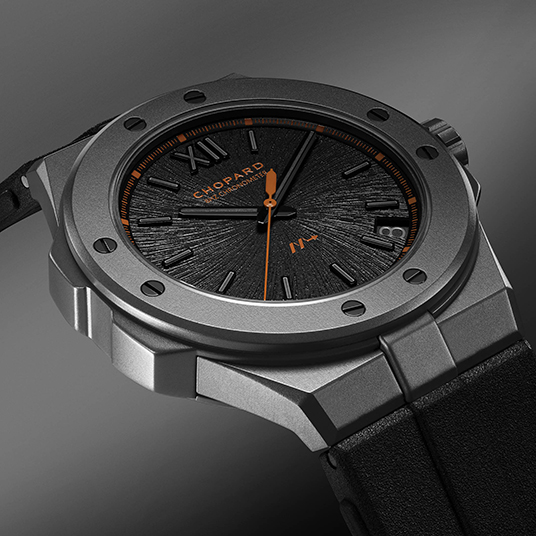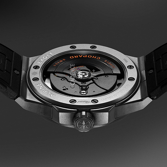 仕様:時・分・秒表示、4時と5時位置にセミインスタントの日付表示、ストップセコンド機能、イーグルの虹彩に着想を得たサンバーストモチーフを型打ちしたピッチブラックPVD加工チタン製文字盤、シースルーケースバック