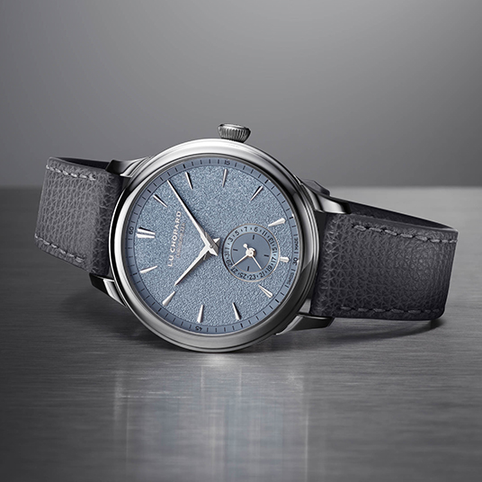 仕様:時・分表示、6時位置にスモールセコンド、6時分位置に日付、ブリッジサイドにパワーリザーブ表示、ストップセコンド機能、PVD加工によるスカイブルーカラーの真鍮製フロスティッドテクスチャー文字盤、シースルーケースバック