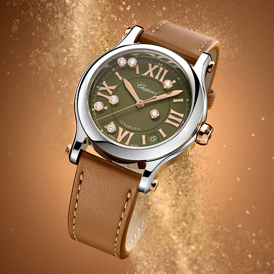 仕様:時・分・秒表示、4時と5時の間に日付表示、フロステッドテクスチャーのカーキカラー文字盤、7石のムービングダイヤモンド、グリーントルマリンをセットしたファセットカットの18Kエシカルローズゴールド製リューズ、シースルーケースバック