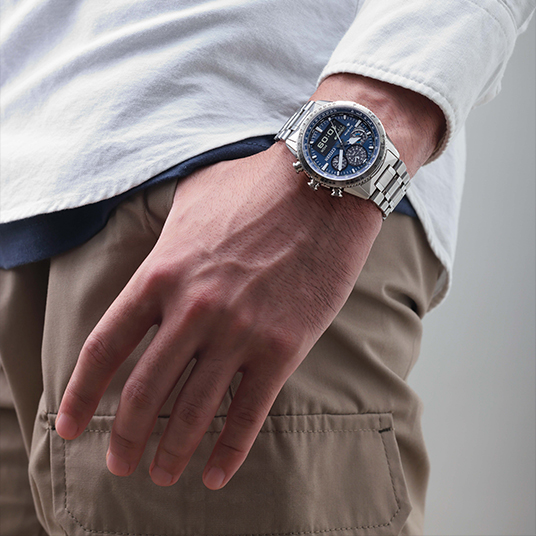 仕様:時・分・秒・日付・曜日表示、パワーセーブ機能、ワールドタイム機能(43時差)、クロノグラフ機能(1/100秒、24時間計)、タイマー(最大99分59秒)、アラーム、ライトレベル インディケーター、パーペチュアルカレンダー、充電量表示機能、サマータイム機能、LED、夜光(針+インデックス)、航空計算尺、文字板部品に再生素材を使用、1種耐磁時計