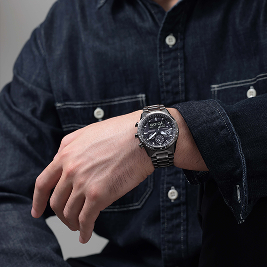 仕様:時・分・秒・日付・曜日表示、パワーセーブ機能、ワールドタイム機能(43時差)、クロノグラフ機能(1/100秒、24時間計)、タイマー(最大99分59秒)、アラーム、ライトレベル インディケーター、パーペチュアルカレンダー、充電量表示機能、サマータイム機能、LED、夜光(針+インデックス)、航空計算尺、文字板部品に再生素材を使用、1種耐磁時計